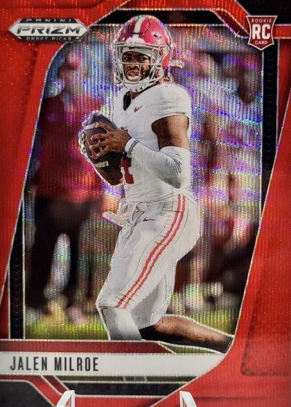 The Jalen Milroe 2025 Prizm Draft Picks #5 Ruby Wave Rookie card in Raw condition has moved down -$4.00 (-80.0%) in the last 30 days and was last sold for $1.00 .