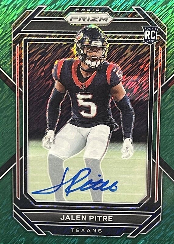 This card is 1 of 16 Jalen Pitre's card variations in the 2022 Prizm set being tracked by Sports Card Investor, including Rookie Autographs, Rookie Autographs - No Huddle, Rookie Autographs - Red Wave /149, Rookie Autographs - Green Scope /75, and Rookie Autographs - Purple Power /49.