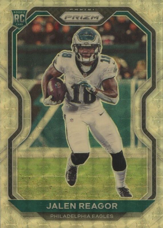This card is 1 of 58 Jalen Reagor's card variations in the 2020 Prizm set being tracked by Sports Card Investor, including Base, Disco, Green, Lazer, and Light Blue.