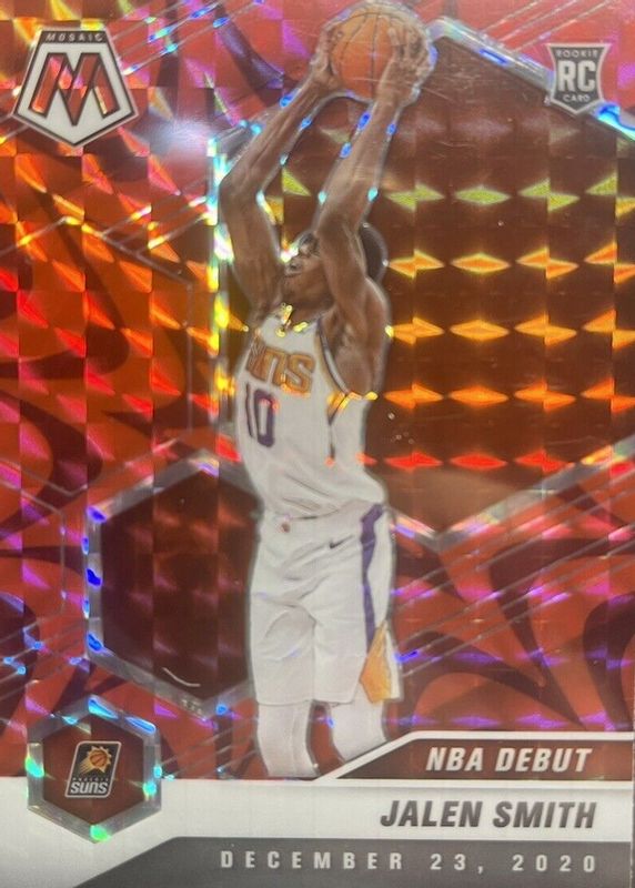 The Jalen Smith 2020 Mosaic #275 NBA Debut - Reactive Red Rookie card in Raw condition has not changed in price in the last 30 days and was last sold for $1.99 .