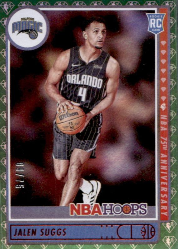 The Jalen Suggs 2021 Hoops #210 75th Anniversary /75 Rookie card in Raw condition has not changed in price in the last 30 days and was last sold for $11.75 .