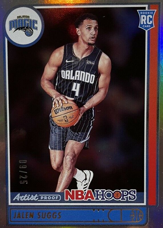 The Jalen Suggs 2021 Hoops #210 Artist Proof /25 Rookie card in Raw condition has not changed in price in the last 30 days and was last sold for $63.50 .