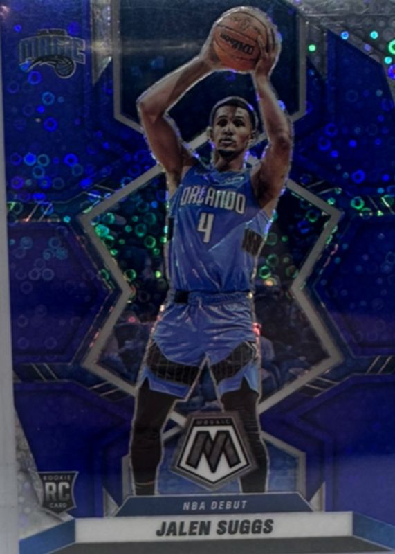 The Jalen Suggs 2021 Mosaic #266 NBA Debut - Fast Break Blue /85 Rookie card in Raw condition has not changed in price in the last 30 days and was last sold for $22.00 .