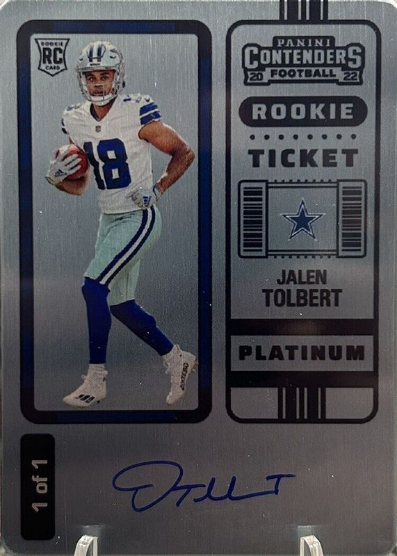 The Jalen Tolbert 2022 Contenders #122 Rookie Ticket Auto - Platinum /1 card in Raw condition has not changed in price in the last 30 days and was last sold for $152.50 .