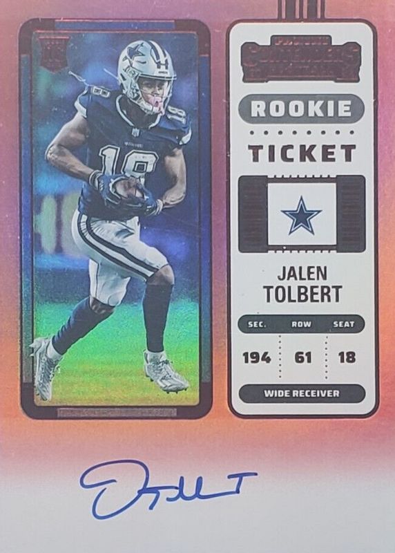 This card is 1 of 30 Jalen Tolbert's card variations in the 2022 Contenders set being tracked by Sports Card Investor, including Rookie Ticket Auto, Rookie Ticket Auto - Silver (/49), Rookie Ticket Auto - Ticket Stub (/18), Rookie Ticket Auto - Wild Card, and Rookie Ticket Auto - Playoff Ticket /99.