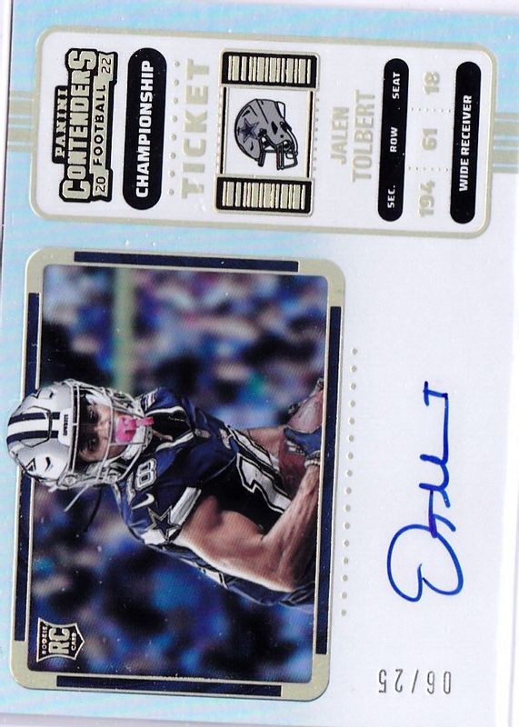 This card is 1 of 30 Jalen Tolbert's card variations in the 2022 Contenders set being tracked by Sports Card Investor, including Rookie Ticket Auto, Rookie Ticket Auto - Red Zone Ticket, Rookie Ticket Auto - Silver (/49), Rookie Ticket Auto - Ticket Stub (/18), and Rookie Ticket Auto - Wild Card.