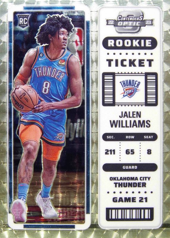 This card is 1 of 72 Jalen Williams' card variations in the 2022 Contenders Optic set being tracked by Sports Card Investor, including Asia, Asia Red Wave, Red, Silver, and Blue /99.