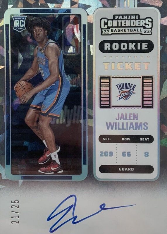 The Jalen Williams 2022 Contenders #115 Rookie Ticket Auto - Cracked Ice Ticket /25 card in Raw condition has not changed in price in the last 30 days and was last sold for $1,372.00 .