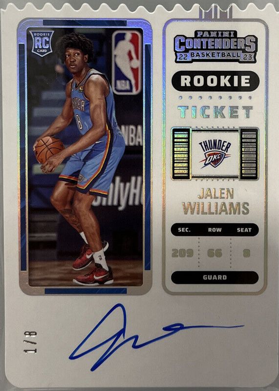 The Jalen Williams 2022 Contenders #115 Rookie Ticket Auto - Ticket Stub (/8) card in Raw condition has not changed in price in the last 30 days and was last sold for $1,200.00 .