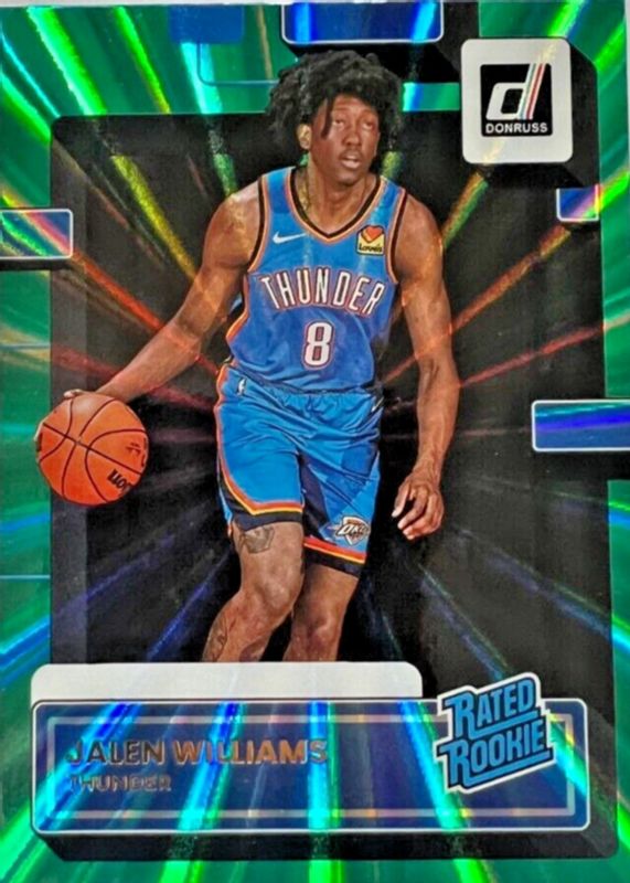 The Jalen Williams 2022 Donruss #212 Holo Green Laser Rookie card in Raw condition has moved down -$0.63 (-21.0%) in the last 30 days and was last sold for $2.37 .