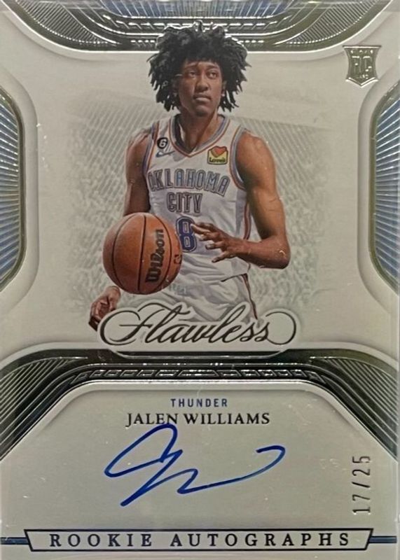 The Jalen Williams 2022 Flawless #RA-JWL Rookie Autographs /25 card in Raw condition has not changed in price in the last 30 days and was last sold for $504.59 .