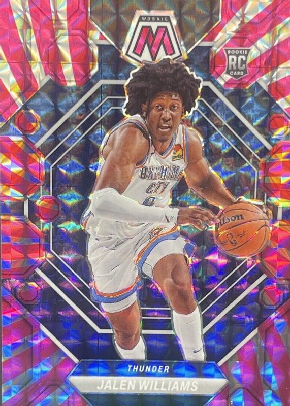 This card is 1 of 66 Jalen Williams' card variations in the 2022 Mosaic set being tracked by Sports Card Investor, including Base, Blue Wave, Choice Red & Green, Fast Break, and Green.