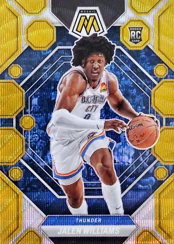This card is 1 of 66 Jalen Williams' card variations in the 2022 Mosaic set being tracked by Sports Card Investor, including Base, Blue Wave, Choice Red & Green, Fast Break, and Green.