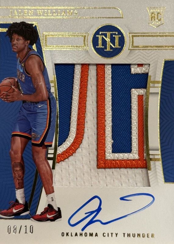 This card is 1 of 10 Jalen Williams' card variations in the 2022 National Treasures set being tracked by Sports Card Investor, including Rookie Patch Auto /99, Rookie Patch Auto - Red /75, Rookie Patch Auto - Bronze /49, Rookie Patch Auto - Pink /25, and Rookie Patch Auto - Gold FOTL /24.