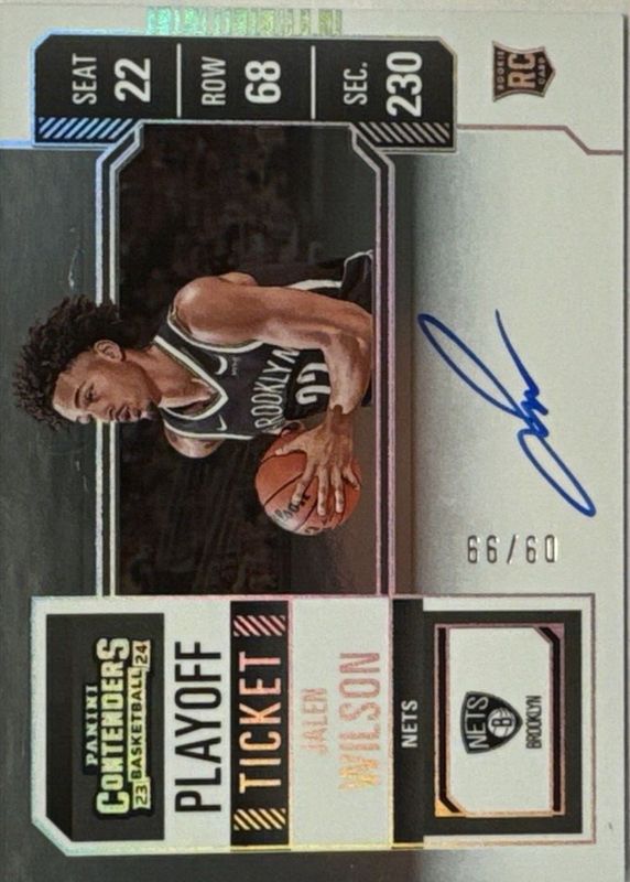 The Jalen Wilson 2023 Contenders #112 Rookie Ticket Auto Variation - Playoff Ticket /99 card in Raw condition has not changed in price in the last 30 days and was last sold for $6.50 .