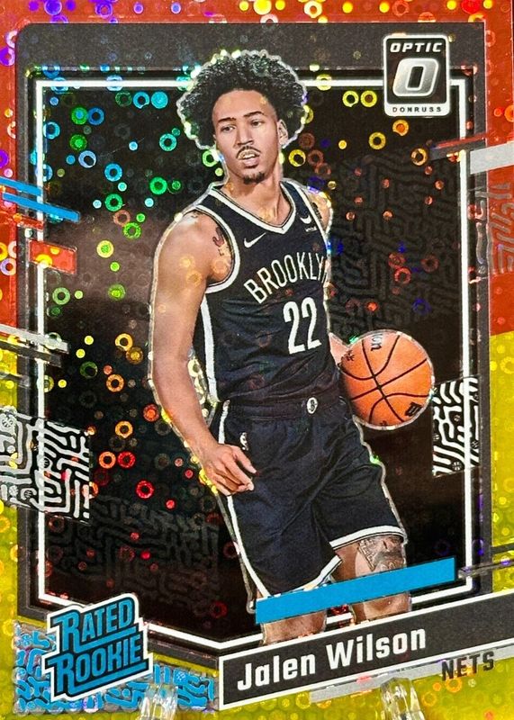 The Jalen Wilson 2023 Optic #206 Fast Break Red & Yellow /7 Rookie card in Raw condition has not changed in price in the last 30 days and was last sold for $90.00 .