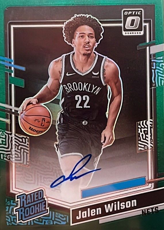 The Jalen Wilson 2023 Optic #291 Rated Rookie Signatures - Green /5 card in Raw condition has not changed in price in the last 30 days and was last sold for $130.00 .