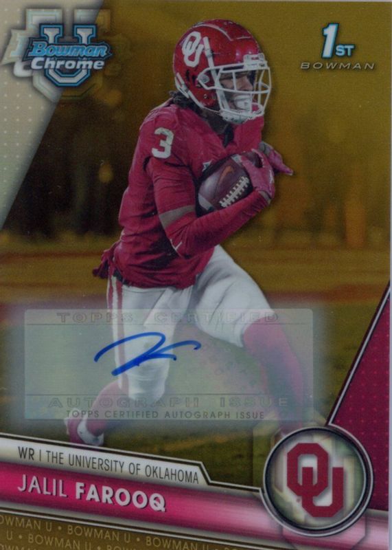 Best Prices Available For Sale of Jalil Farooq 2023 Bowman Chrome University #129 Prospect Auto - Gold Refractor /50 (1st)