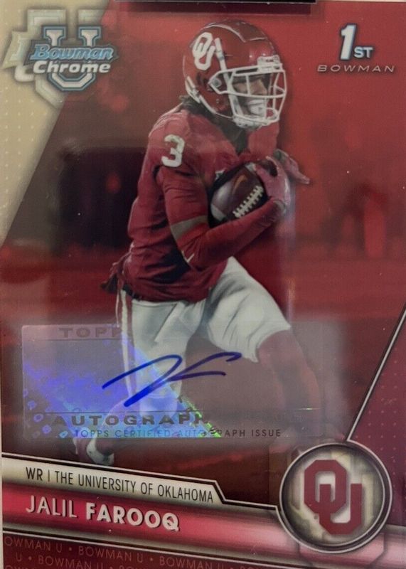 This card is 1 of 12 Jalil Farooq's card variations in the 2023 Bowman Chrome University set being tracked by Sports Card Investor, including Prospect Auto (1st), Prospect Auto - Refractor /499 (1st), Prospect Auto - Fuchsia Mini-Diamond Refractor /150 (1st), Prospect Auto - Green Refractor /99 (1st), and Prospect Auto - Yellow Refractor /75 (1st).