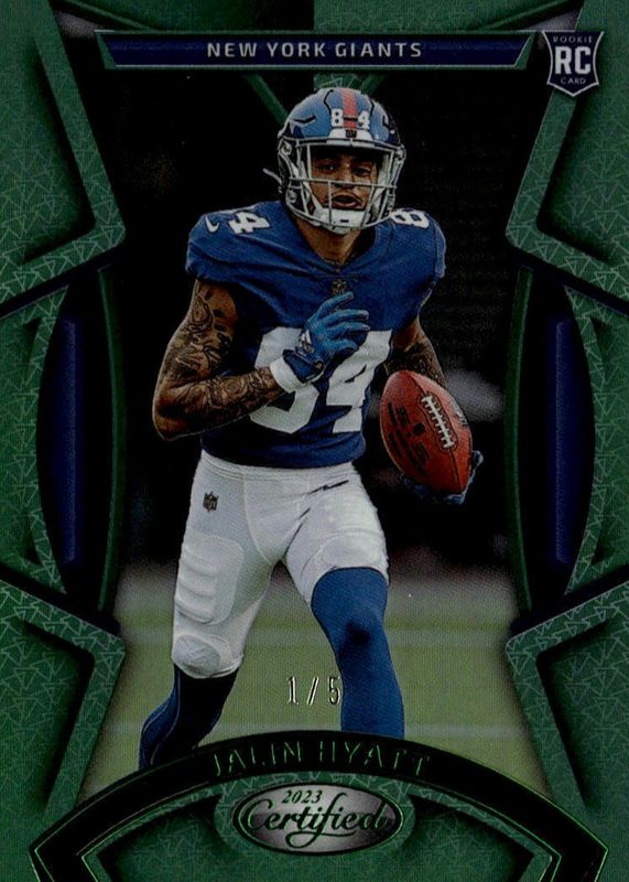 The Jalin Hyatt 2023 Certified #126 FOTL Mirror Green /5 Rookie card in Raw condition has not changed in price in the last 30 days and was last sold for $12.50 .
