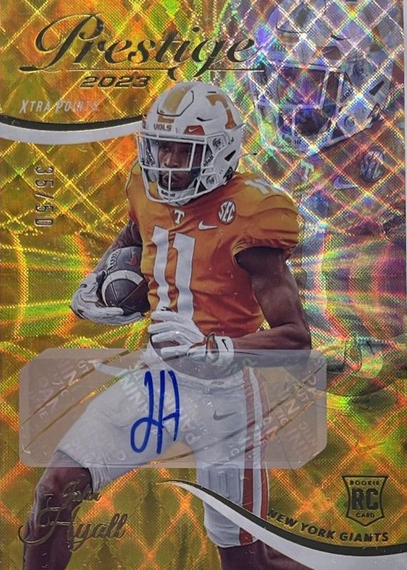 This card is 1 of 12 Jalin Hyatt's card variations in the 2023 Prestige set being tracked by Sports Card Investor, including Base, Draft Day Signatures, NFL Passport Signatures, Xtra Points Signatures - Red /199, and Xtra Points Signatures - Blue /99.