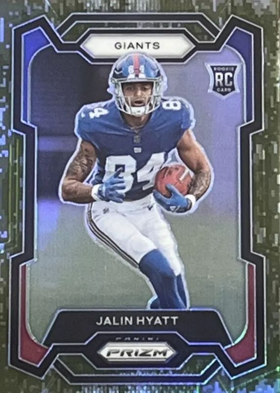 This card is 1 of 83 Jalin Hyatt's card variations in the 2023 Prizm set being tracked by Sports Card Investor, including Base, Disco, Green, Green Ice, and Green Wave.