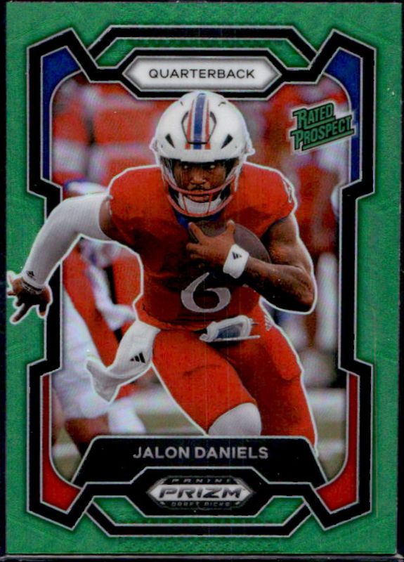 The Jalon Daniels 2024 Prizm Draft Picks #200 Green card is 1 of 61 Jalon Daniels' card variations in the 2024 Prizm Draft Picks set being tracked by Sports Card Investor, including Base, Purple Wave, Red Ice, Ruby Wave, and Silver.
