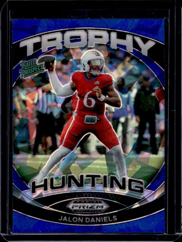 The Jalon Daniels 2024 Prizm Draft Picks #TH-JDS Trophy Hunting - Blue Ice /99 card is 1 of 61 Jalon Daniels' card variations in the 2024 Prizm Draft Picks set being tracked by Sports Card Investor, including Base, Green, Purple Wave, Red Ice, and Ruby Wave.