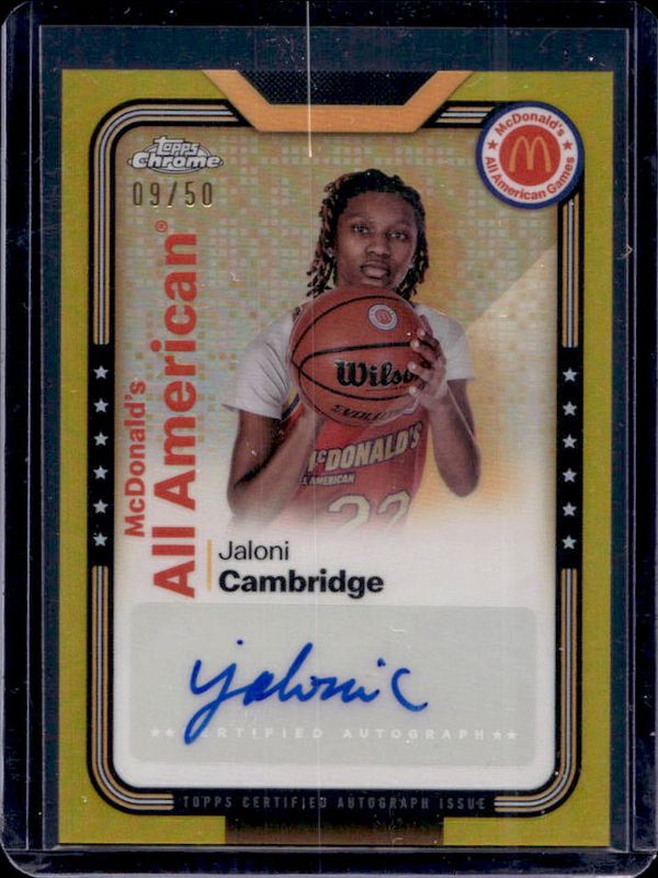 The Jaloni Cambridge 2024 Topps Chrome McDonald's All-American #SMS-JAL All-American Autographs - Gold Refractor /50 card is 1 of 112 Jaloni Cambridge's card variations in the 2024 Topps Chrome McDonald's All-American set being tracked by Sports Card Investor, including #64 Base, #14 Base, #14 Blue RayWave Refractor, #64 Blue RayWave Refractor, and #14 McDonald's Logo Refractor.