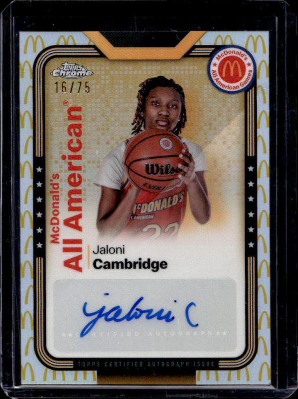 The Jaloni Cambridge 2024 Topps Chrome McDonald's All-American #SMS-JAL All-American Autographs - McDonald's Logo Refractor /75 card is 1 of 112 Jaloni Cambridge's card variations in the 2024 Topps Chrome McDonald's All-American set being tracked by Sports Card Investor, including #64 Base, #14 Base, #14 Blue RayWave Refractor, #64 Blue RayWave Refractor, and #14 McDonald's Logo Refractor.