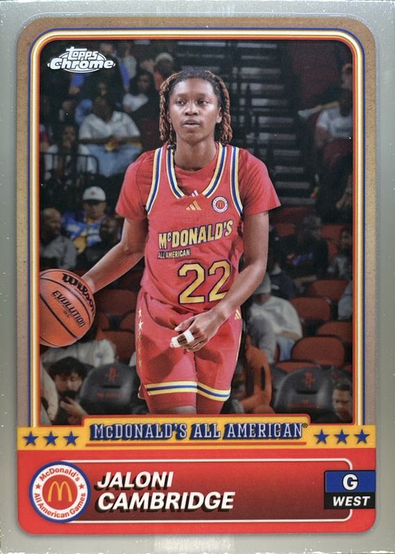 The Jaloni Cambridge 2024 Topps Chrome McDonald's All-American #14 Base card is 1 of 112 Jaloni Cambridge's card variations in the 2024 Topps Chrome McDonald's All-American set being tracked by Sports Card Investor, including #64 Base, #14 Blue RayWave Refractor, #64 Blue RayWave Refractor, #14 McDonald's Logo Refractor, and #64 McDonald's Logo Refractor.