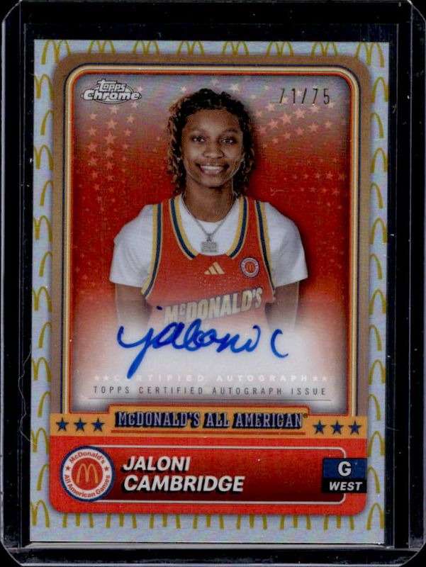 The Jaloni Cambridge 2024 Topps Chrome McDonald's All-American #64 Base Autographs - McDonald's Logo Refractor /75 card is 1 of 112 Jaloni Cambridge's card variations in the 2024 Topps Chrome McDonald's All-American set being tracked by Sports Card Investor, including #64 Base, #14 Base, #14 Blue RayWave Refractor, #64 Blue RayWave Refractor, and #14 McDonald's Logo Refractor.