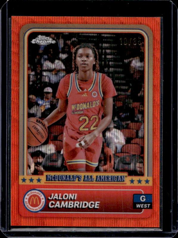 The Jaloni Cambridge 2024 Topps Chrome McDonald's All-American #14 Orange Wave Refractor /35 card is 1 of 112 Jaloni Cambridge's card variations in the 2024 Topps Chrome McDonald's All-American set being tracked by Sports Card Investor, including #64 Base, #14 Base, #14 Blue RayWave Refractor, #64 Blue RayWave Refractor, and #14 McDonald's Logo Refractor.
