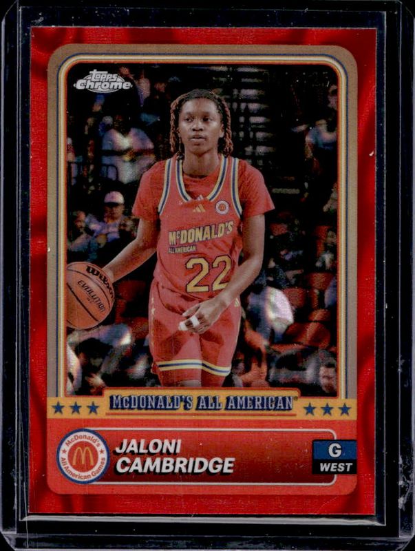 The Jaloni Cambridge 2024 Topps Chrome McDonald's All-American #14 Red Lava Refractor /125 card is 1 of 112 Jaloni Cambridge's card variations in the 2024 Topps Chrome McDonald's All-American set being tracked by Sports Card Investor, including #64 Base, #14 Base, #14 Blue RayWave Refractor, #64 Blue RayWave Refractor, and #14 McDonald's Logo Refractor.
