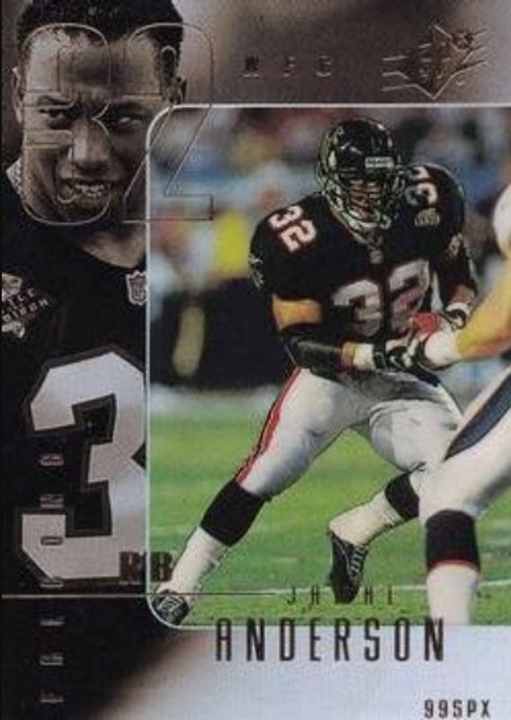 The Jamal Anderson 1999 SPx #4 Base /1999 card is 1 of 5 Jamal Anderson's card variations in the 1999 SPx set being tracked by Sports Card Investor, including Radiance /100, Spectrum /1, Masters, and Prolifics.