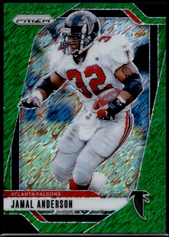 The Jamal Anderson 2024 Prizm #18 Green Shimmer /5 card is 1 of 84 Jamal Anderson's card variations in the 2024 Prizm set being tracked by Sports Card Investor, including Base, Choice Blue Yellow Green, Choice Silver, Disco, and Green.