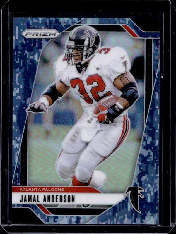 The Jamal Anderson 2024 Prizm #18 Navy Camo /25 card is 1 of 84 Jamal Anderson's card variations in the 2024 Prizm set being tracked by Sports Card Investor, including Base, Choice Blue Yellow Green, Choice Silver, Disco, and Green.