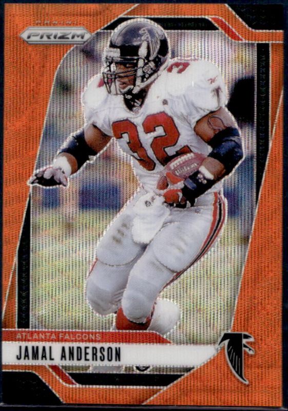 The Jamal Anderson 2024 Prizm #18 Orange Wave /60 card is 1 of 84 Jamal Anderson's card variations in the 2024 Prizm set being tracked by Sports Card Investor, including Base, Choice Blue Yellow Green, Choice Silver, Disco, and Green.