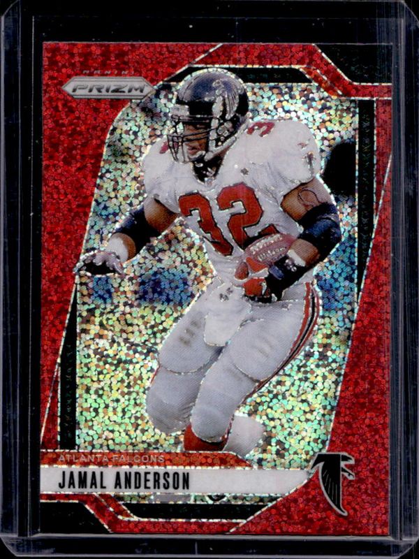 The Jamal Anderson 2024 Prizm #18 Red Sparkle /(SSP) card is 1 of 84 Jamal Anderson's card variations in the 2024 Prizm set being tracked by Sports Card Investor, including Base, Choice Blue Yellow Green, Choice Silver, Disco, and Green.
