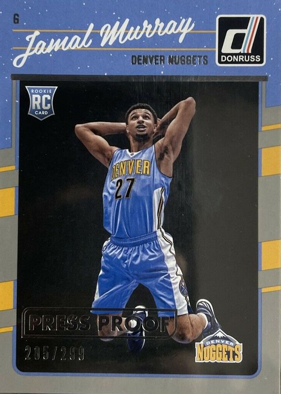 The Jamal Murray 2016 Donruss #157 Press Proof Silver /299 Rookie card in Raw condition has not changed in price in the last 30 days and was last sold for $5.98 .