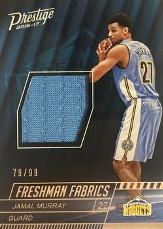 The Jamal Murray 2016 Prestige #22 Freshman Fabrics /99 Rookie card is 1 of 22 Jamal Murray's card variations in the 2016 Prestige set being tracked by Sports Card Investor, including Base, Crystal, Horizon, Metallized, and Rain.