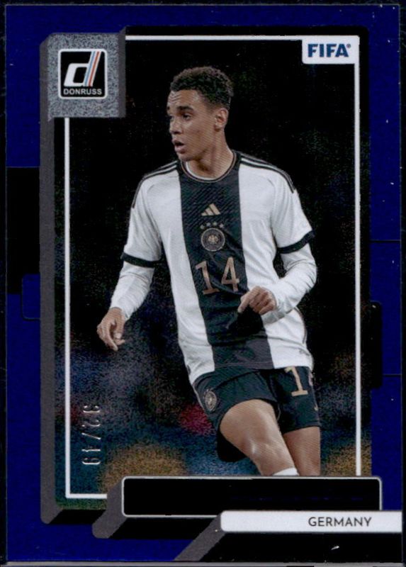 The Jamal Musiala 2022 Donruss #56 Blue /49 card is 1 of 26 Jamal Musiala's card variations in the 2022 Donruss set being tracked by Sports Card Investor, including Base, Green, Optic, Optic - Green Ice, and Optic - Holo.