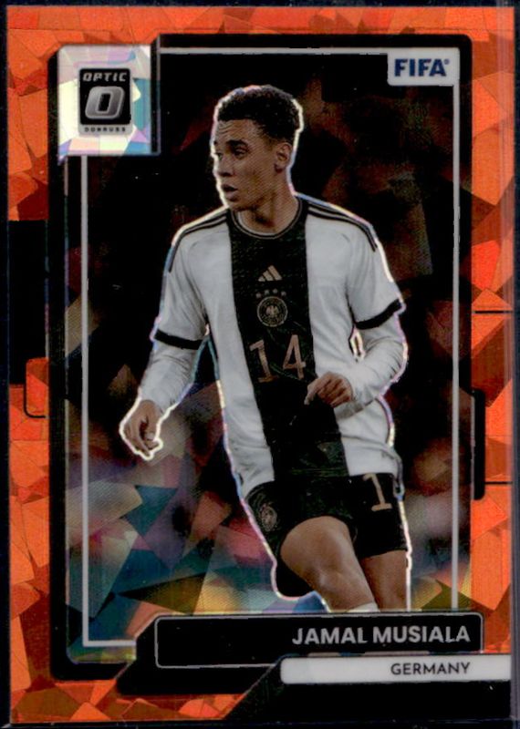The Jamal Musiala 2022 Donruss #56 Optic - Orange Ice card is 1 of 26 Jamal Musiala's card variations in the 2022 Donruss set being tracked by Sports Card Investor, including Base, Green, Optic, Optic - Green Ice, and Optic - Holo.