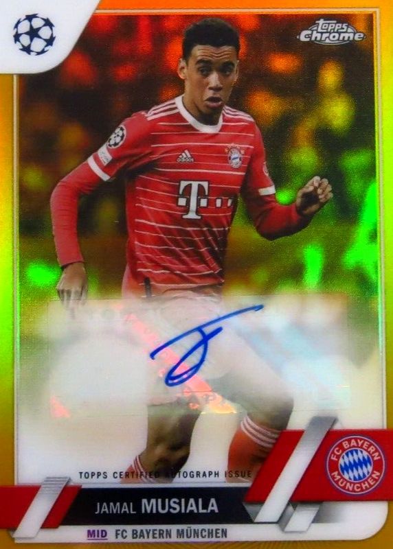 The Jamal Musiala 2022 Topps Chrome UEFA Club Competitions #CA-JM Autographs - Gold Refractor /50 card in Raw condition has not changed in price in the last 30 days and was last sold for $112.50 .