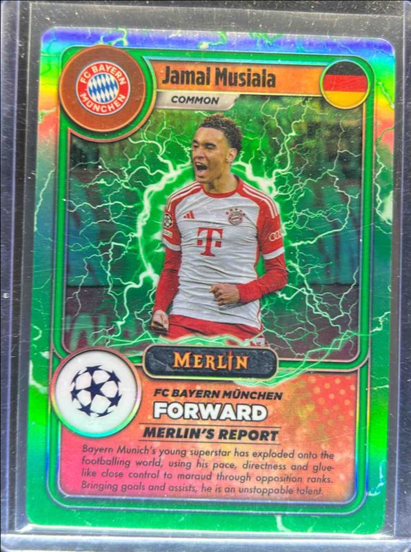 The Jamal Musiala 2023 Topps Merlin Chrome UEFA Club Competitions #MG-12 Merlin's Gamers card is 1 of 48 Jamal Musiala's card variations in the 2023 Topps Merlin Chrome UEFA Club Competitions set being tracked by Sports Card Investor, including Base, Aqua Prism Refractor, Refractor, Vintage Merlin Refractor, and Neon Green Shimmer Refractor /399.