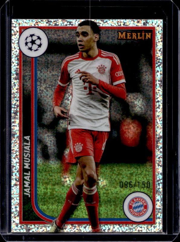 The Jamal Musiala 2023 Topps Merlin Chrome UEFA Club Competitions #41 Speckle Refractor /150 card is 1 of 48 Jamal Musiala's card variations in the 2023 Topps Merlin Chrome UEFA Club Competitions set being tracked by Sports Card Investor, including Base, Aqua Prism Refractor, Refractor, Vintage Merlin Refractor, and Neon Green Shimmer Refractor /399.