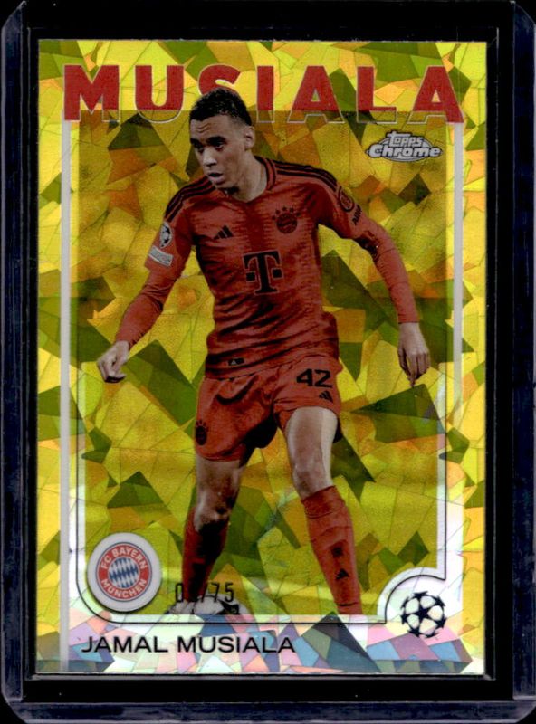 The Jamal Musiala 2024 Topps Chrome Sapphire UEFA Club Competitions #42 Yellow /75 card is 1 of 25 Jamal Musiala's card variations in the 2024 Topps Chrome Sapphire UEFA Club Competitions set being tracked by Sports Card Investor, including Base, Green /99, Gold /50, Orange /25, and Black /10.