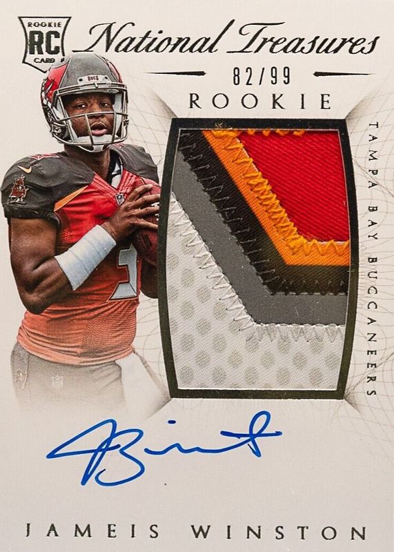The Jameis Winston 2015 National Treasures #107 Rookie Patch Auto /99 card in Raw condition has not changed in price in the last 30 days and was last sold for $144.00 .