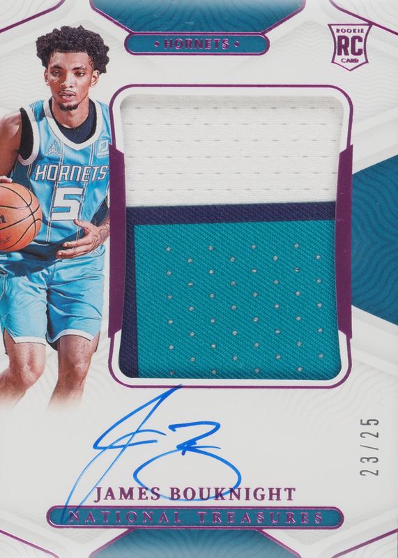 This card is 1 of 10 James Bouknight's card variations in the 2021 National Treasures set being tracked by Sports Card Investor, including Rookie Patch Auto - Bronze (/49), Rookie Patch Auto - NBA 75th (/75), Rookie Patch Auto /99, Rookie Patch Auto - Gold FOTL /24, and Rookie Patch Auto - Gold /10.