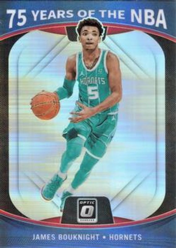 The James Bouknight 2021 Prizm #47 75 Years of the NBA Rookie card is 1 of 97 James Bouknight's card variations in the 2021 Prizm set being tracked by Sports Card Investor, including #311 Base, #311b Base, #311 Photo Variation, #311 Blue NBA 75th Anniversary, and #311 Blue Wave.
